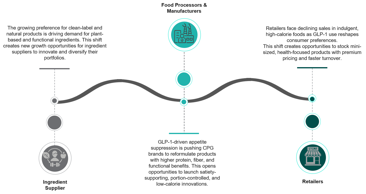 - Increased Demand for Reduced-Calorie/Glycaemic Foods: GLP-1 medications are reshaping not only the quantities, but also the nature of food that consumers choose. This shift presents great opportunities and challenges to the food industry. As the use of GLP-1 medications continues to grow, food companies will face significant challenges, as demand for high-calorie/fat/sugar processed foods steadily declines.