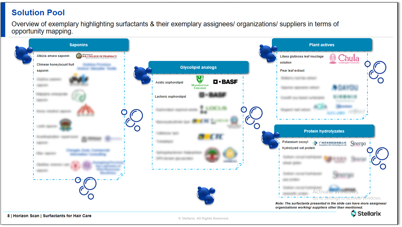 The client seeks a real-time overview of surfactants used in hair care products and mapping of other players’ activities in the domain.
